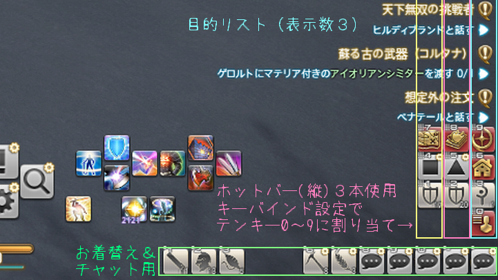ホットバー(縦)を3本使っています。キーバインドで0~9を割り当ててます。